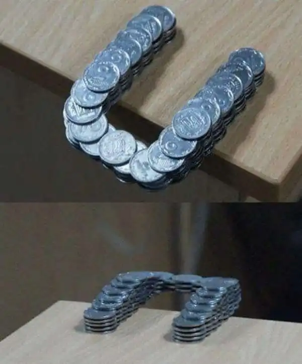 Монеты уложены таким образом, что выступают за край стола и не падают.