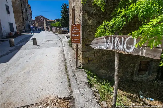 Здесь вместо вывески «Motovun» гостей встречает деревянная табличка «Vino».