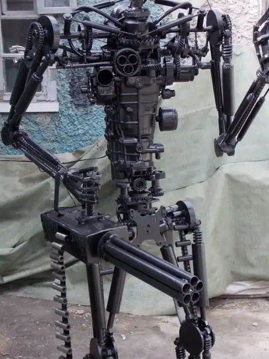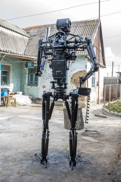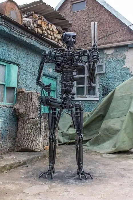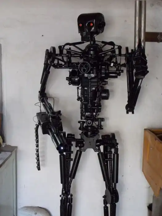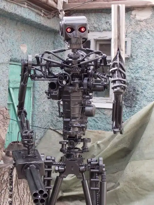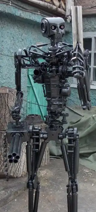 Вот такой вот оригинальный эндоскелет «робота» был создан одним энтузиастом из ненужного автомобильного и бытового железа. 120-килограммовый «Робот» ростом 210 см имеет светодиодные глаза и «вертушку» пулемета. На создание данного экземпляра ушло порядка 6 месяцев.