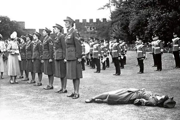 Юная леди из почетного женского королевского армейского корпуса потеряла сознание от жары во время встречи с принцессой Елизаветой, Шрусбери, Англия, 6 июля 1949 года.