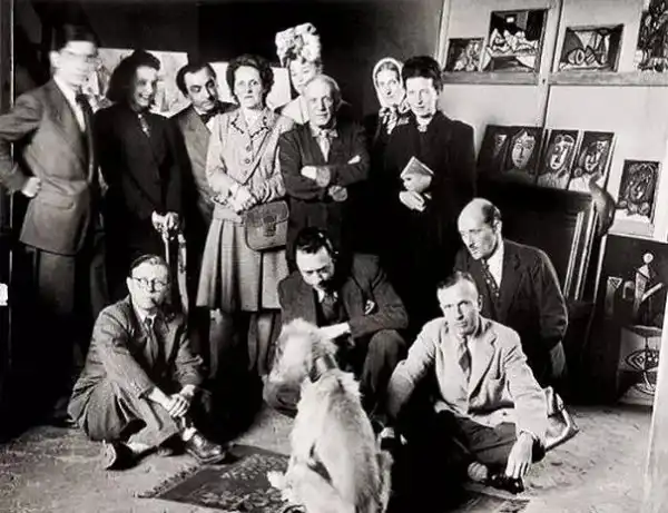 Жан-Поль Сартр, Симона де Бовуар, Пабло Пикассо, Альбер Камю и другие позируют для фото с афганской борзой по кличке Казбек, принадлежавшей Пикассо, 1944 год.