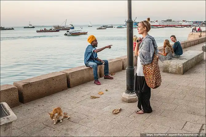 Историческая набережная, старые доу и современные катера с паромами, темнокожий занзибарец, выпрашивающий доллар за фото, белокожие европейцы, ожидающие очередной потрясающей красоты закат и вечно голодный кот…