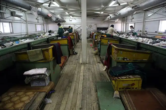 Над этим залом сверху есть лента, где металл отбирается специальным магнитом, а бумага, полиэтилен, пластик и упаковки от бытовой химии извлекаются вручную:
