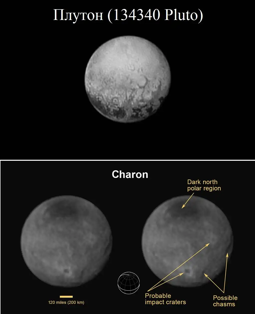Карликовая планета Плутон. Это десятое по массе (без учёта спутников) небесное тело, обращающееся вокруг Солнца — после восьми планет Солнечной системы и Эриды. Площадь поверхности Плутона примерно равна площади России, а масса Плутона составляет лишь 0,2 от массы естественного спутника Земли — Луны. (Фото Johns Hopkins University Applied Physics Laboratory / Southwest Research Institute / NASA):