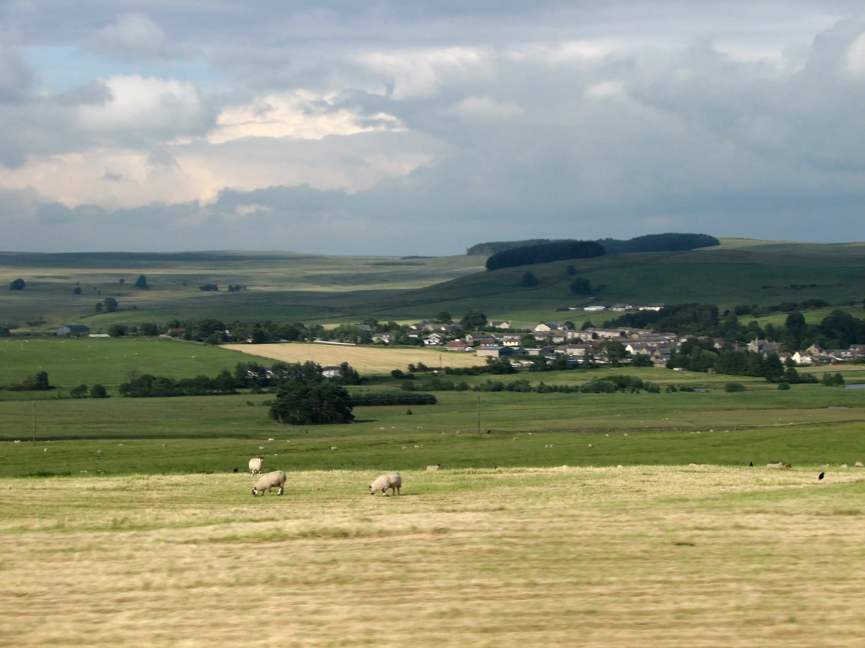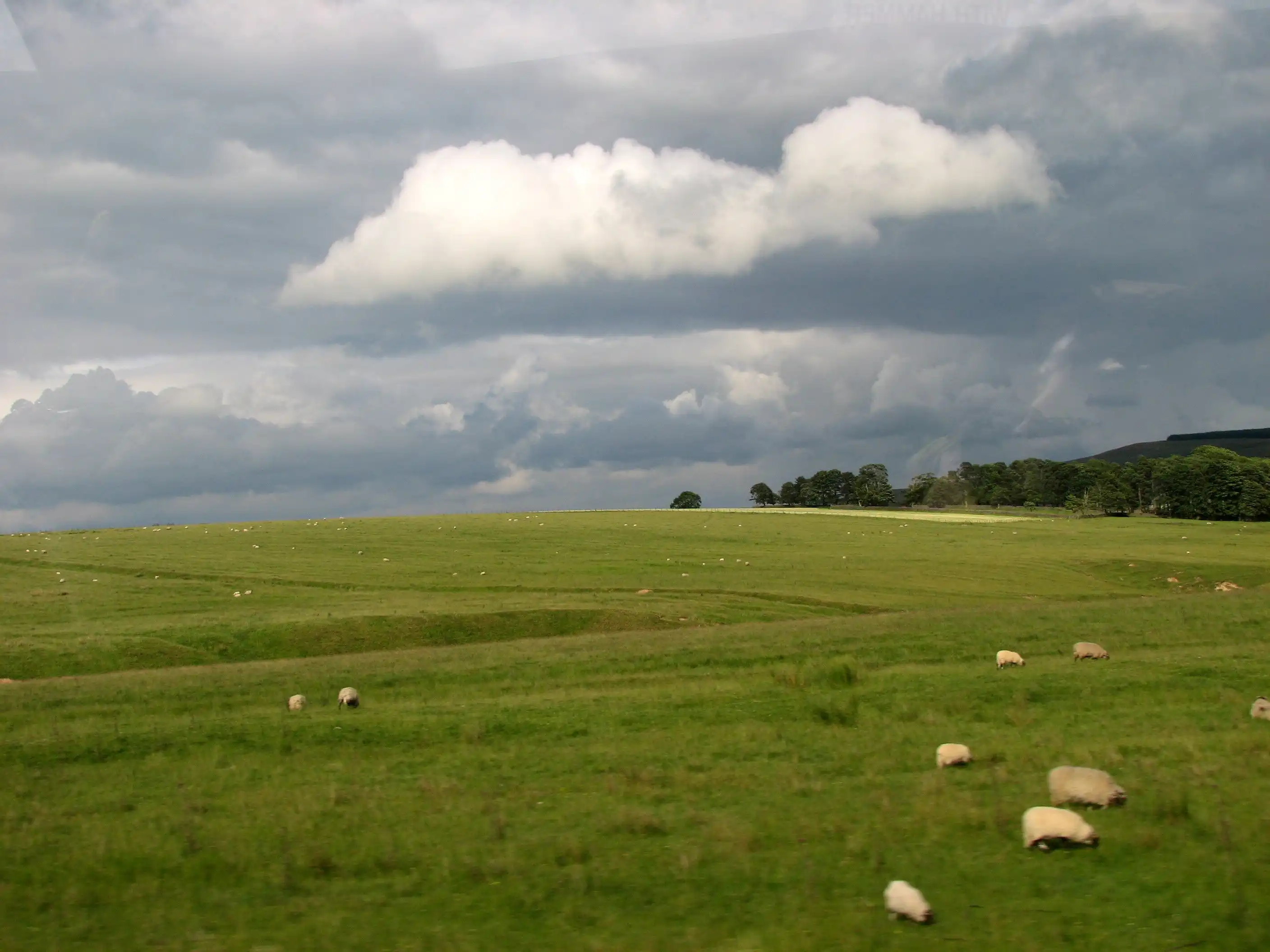 Я фотографировал из машины – это мы ещё едем по территории Англии, но уже очень близко к Шотландии. Белые пятнышки на траве – это овцы.