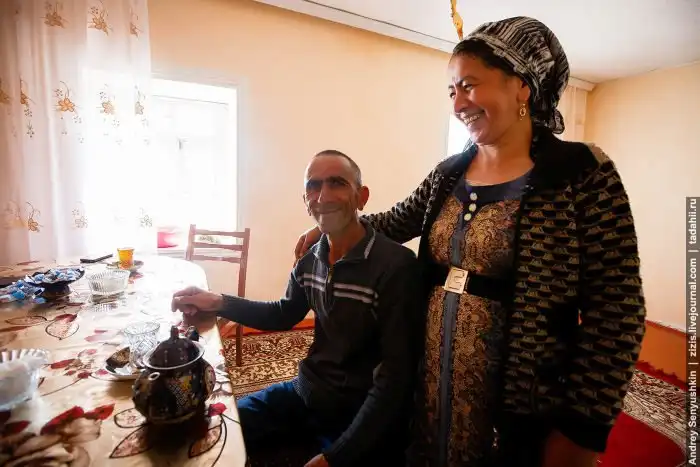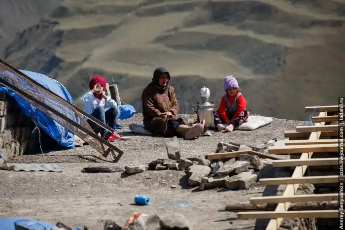 Пока мужики делают обрешетку крыши, женщины и дети на соседней крыше устроили чаепитие. Чай это не только напиток, это жизнь. Все вертится вокруг него. Гостей встречают чаем, вопросы решаются за чаем. Самовары есть в каждом доме и не по одному.