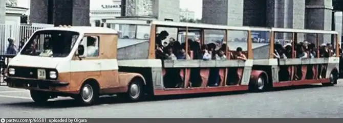 Такие автопоезда изготовили для обслуживания гостей и участников Олимпиады. После её окончания машины передали ВДНХ. Появились автопоезда и в других городах СССР – например, в рижском Межапарке. Рига совсем недалеко от Елгавы, где собирались микроавтобусы RAF, на базе которых и строились эти мини-тягачи. Это далеко не первая модель автопоезда, первые начали выпускать ещё в конце 50-х.