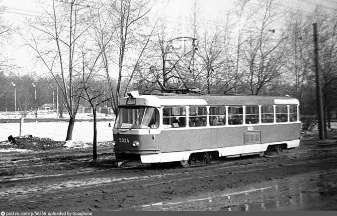Чешский трамвай пробивает себе дорогу на московской весенней распутице.