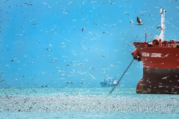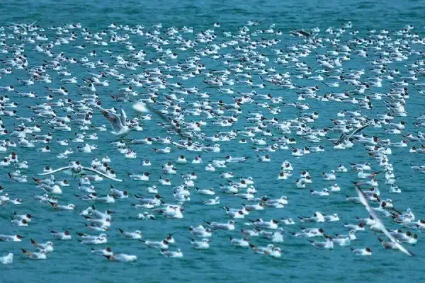Чайки летают ровно над морем, периодически собираясь в группы для отдыха