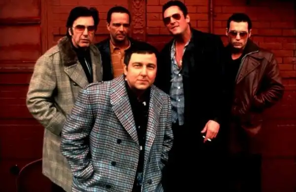 Аль Пачино, Джеймс Руссо, Бруно Кёрби, Майкл Мэдсен и Джонни Депп на съёмках фильма «Донни Браско», 1997 год
