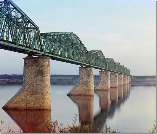 Металлические фермы моста Транс-Сибирской железной дороги на каменных опорах, через реку Кама близ Перми, регион Уральских гор. Около 1910 года.