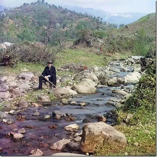 На реке Каролицхвали. Автопортрет фотографа Прокудина-Горского в костюме и шляпе, сидящего на скале рядом с рекой Каролицхвали, с горанами на заднем плане. Между 1905 и 1915 годами.