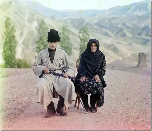 Дагестанские типажи. Мужчина и женщина, позирующие на улице. Между 1905 и 1915 годами.