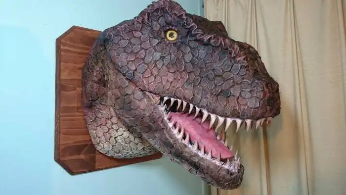 Обычными охотничьими трофеями на стенах сейчас уже мало кого удивишь, поэтому один умелец решил сделать свой собственный необычный трофей – голову тираннозавра.