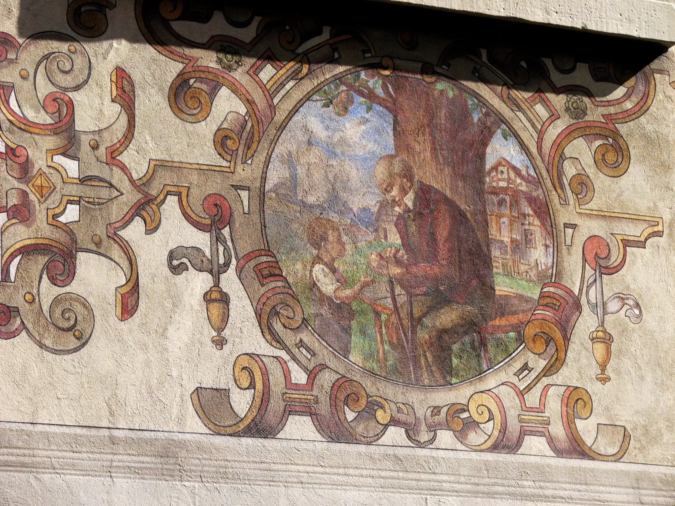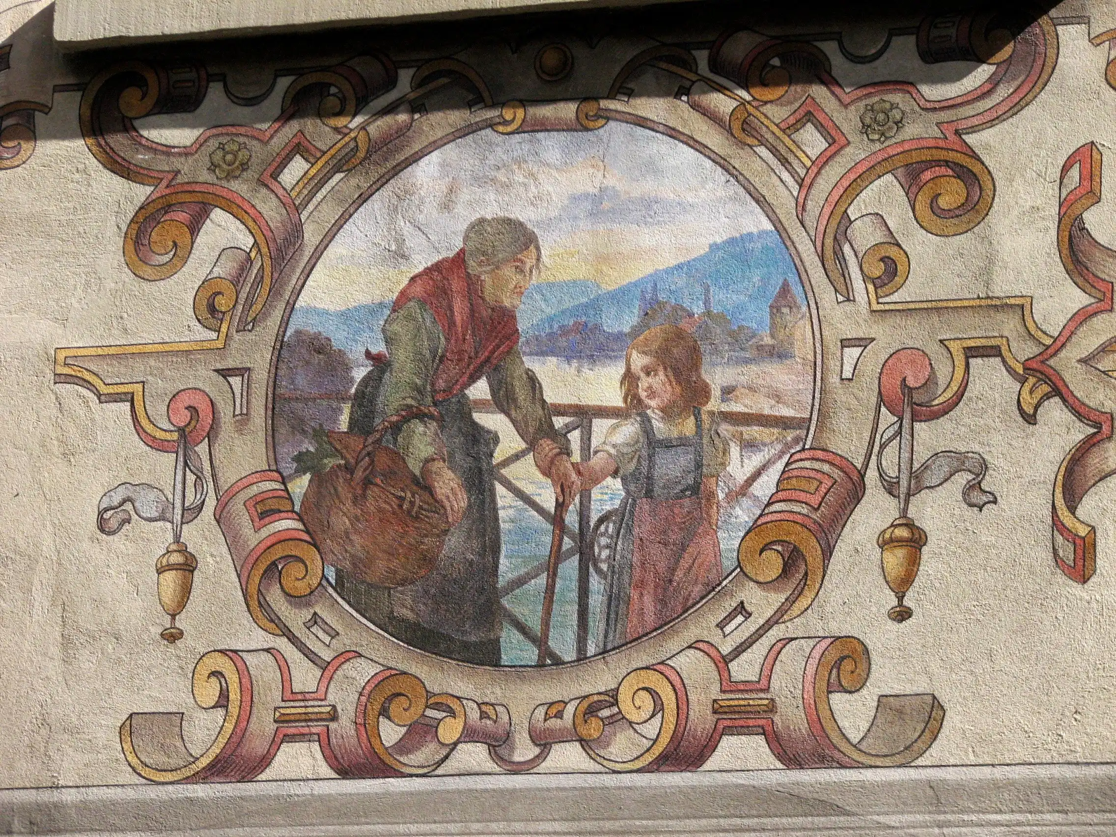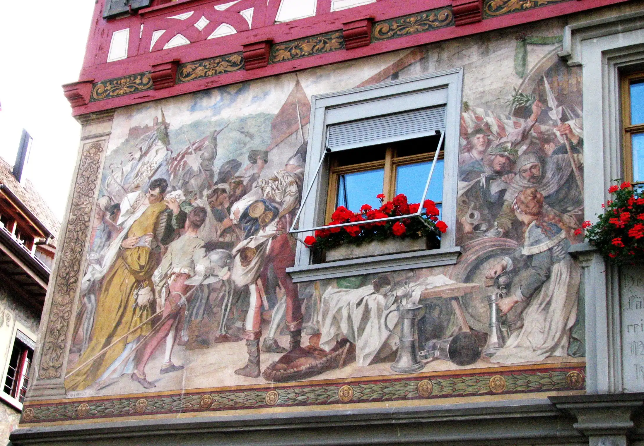 Расписные фасады – одна из “Фишек” Швейцарии. В этом городе таких расписных домов много на центральной улице города. Сюжеты очень разнообразны – от морализаторства до сцен из истории города. Росписи, которые можно видеть на фасадах сегодня, выполнены на рубеже XIX и XX веков в эпоху модерна, но стилизованы под росписи эпохи Возрождения.