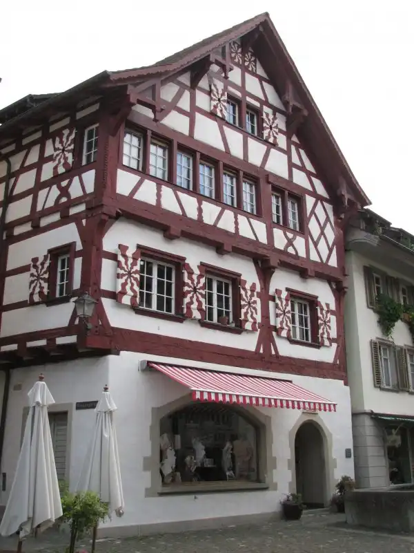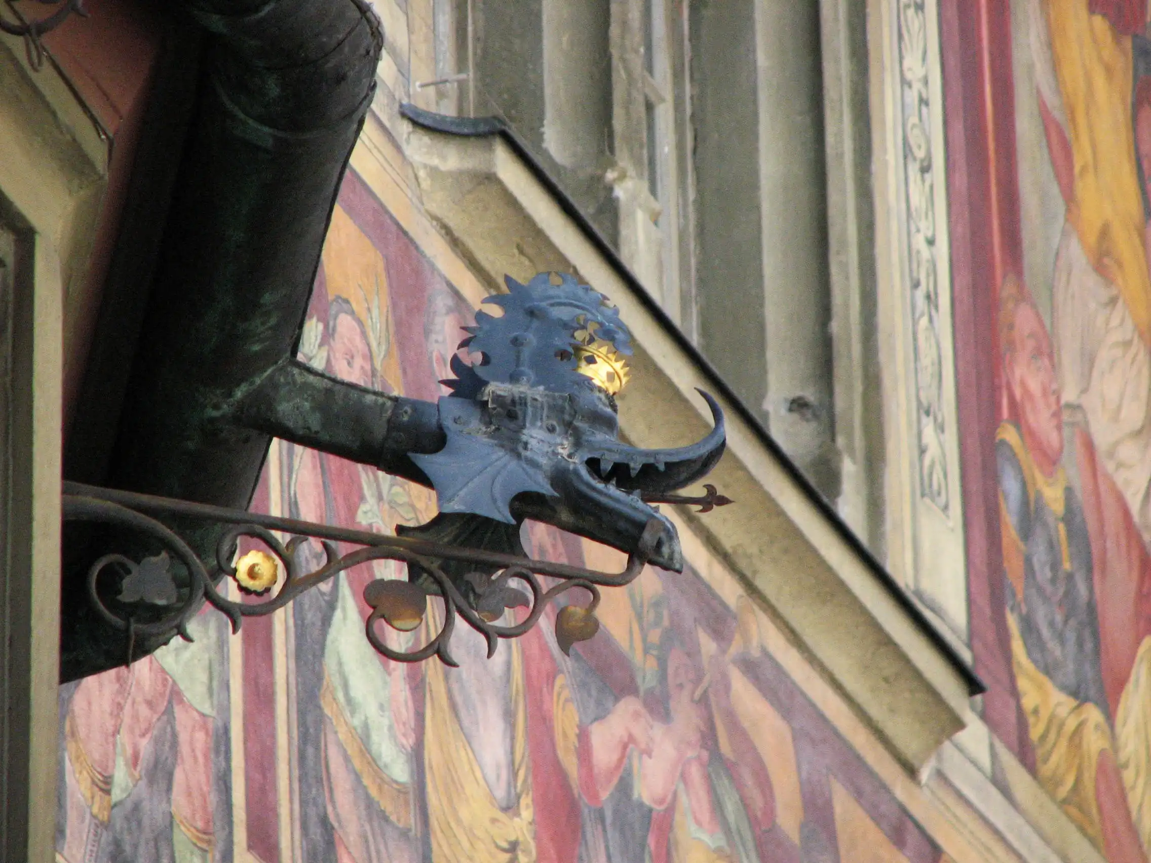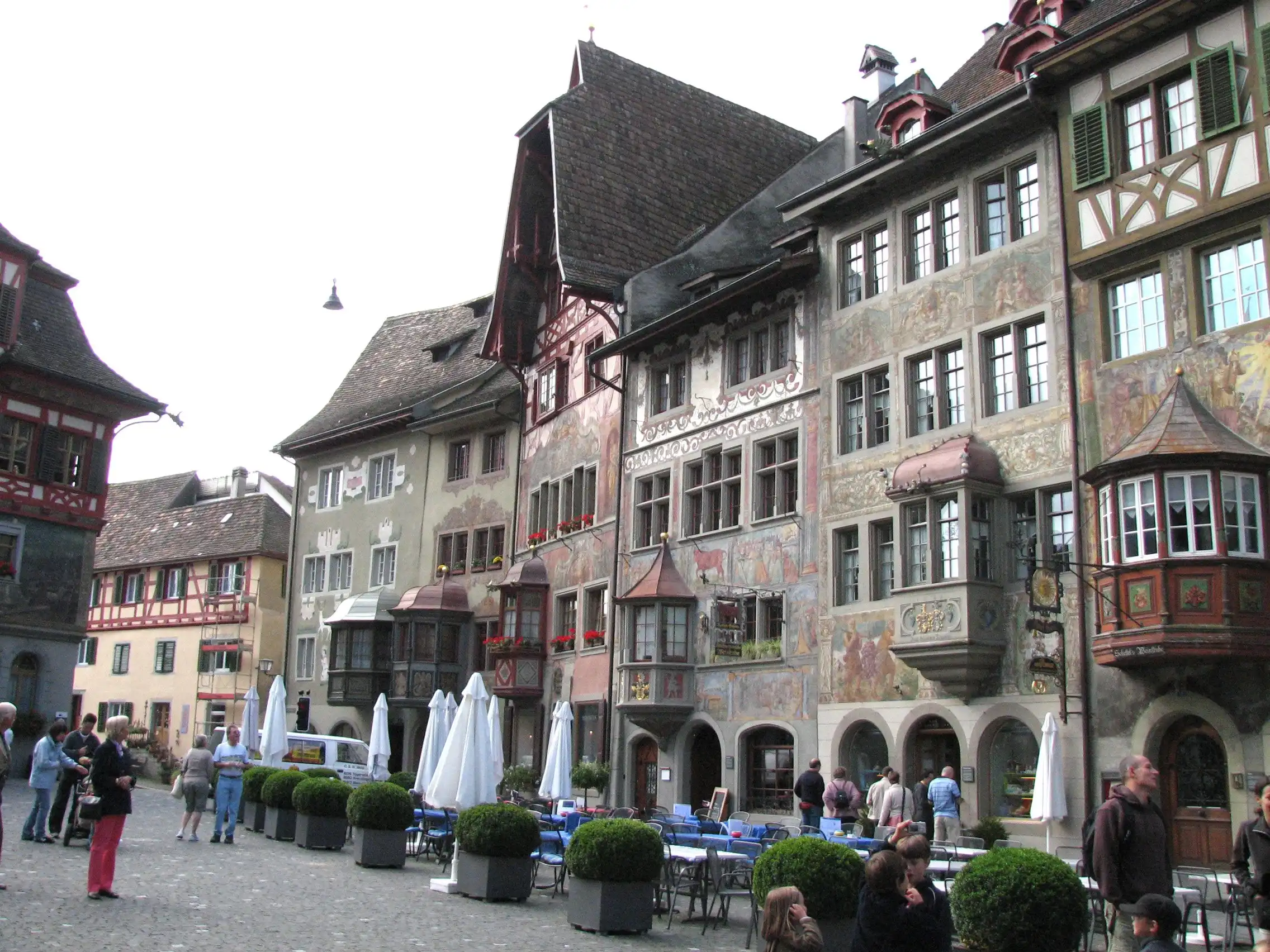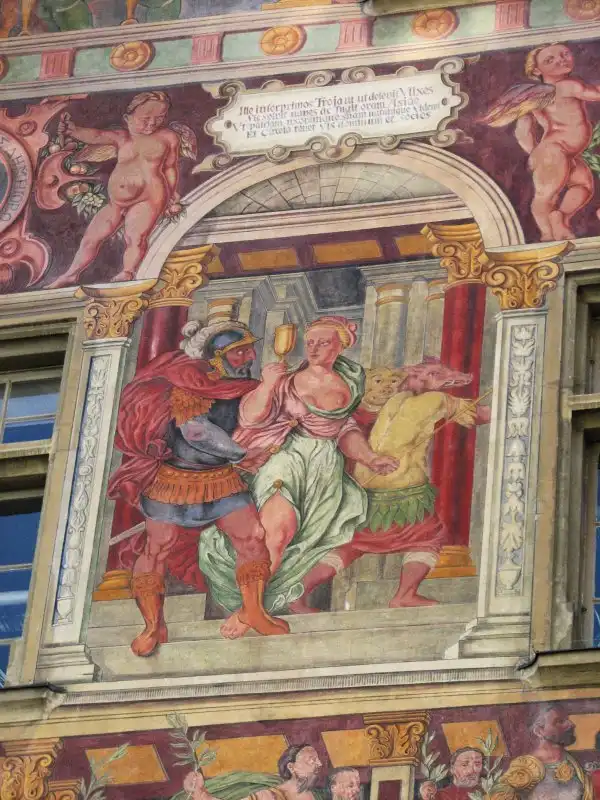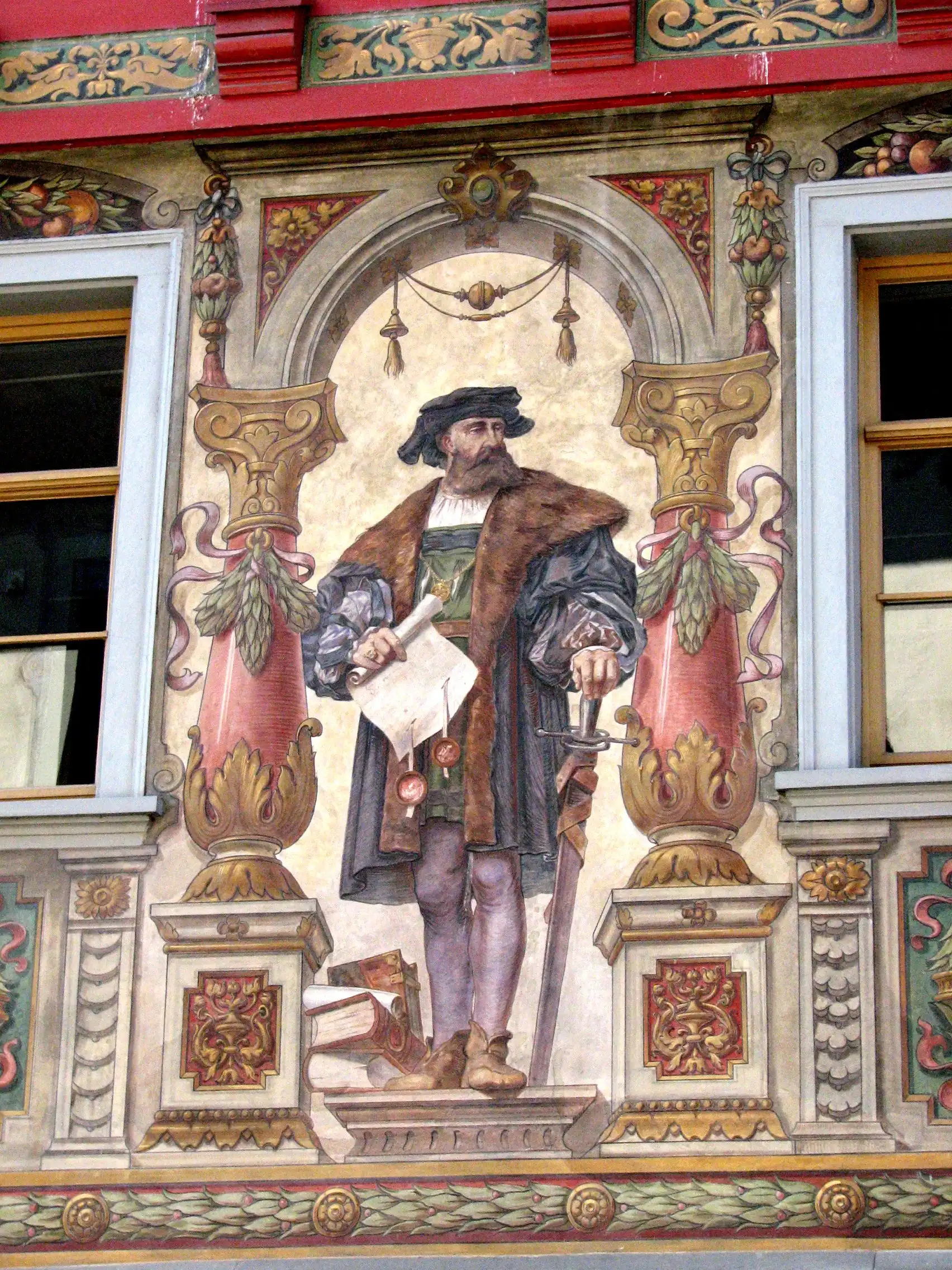 Расписные фасады – одна из “Фишек” Швейцарии. В этом городе таких расписных домов много на центральной улице города. Сюжеты очень разнообразны – от морализаторства до сцен из истории города. Росписи, которые можно видеть на фасадах сегодня, выполнены на рубеже XIX и XX веков в эпоху модерна, но стилизованы под росписи эпохи Возрождения.