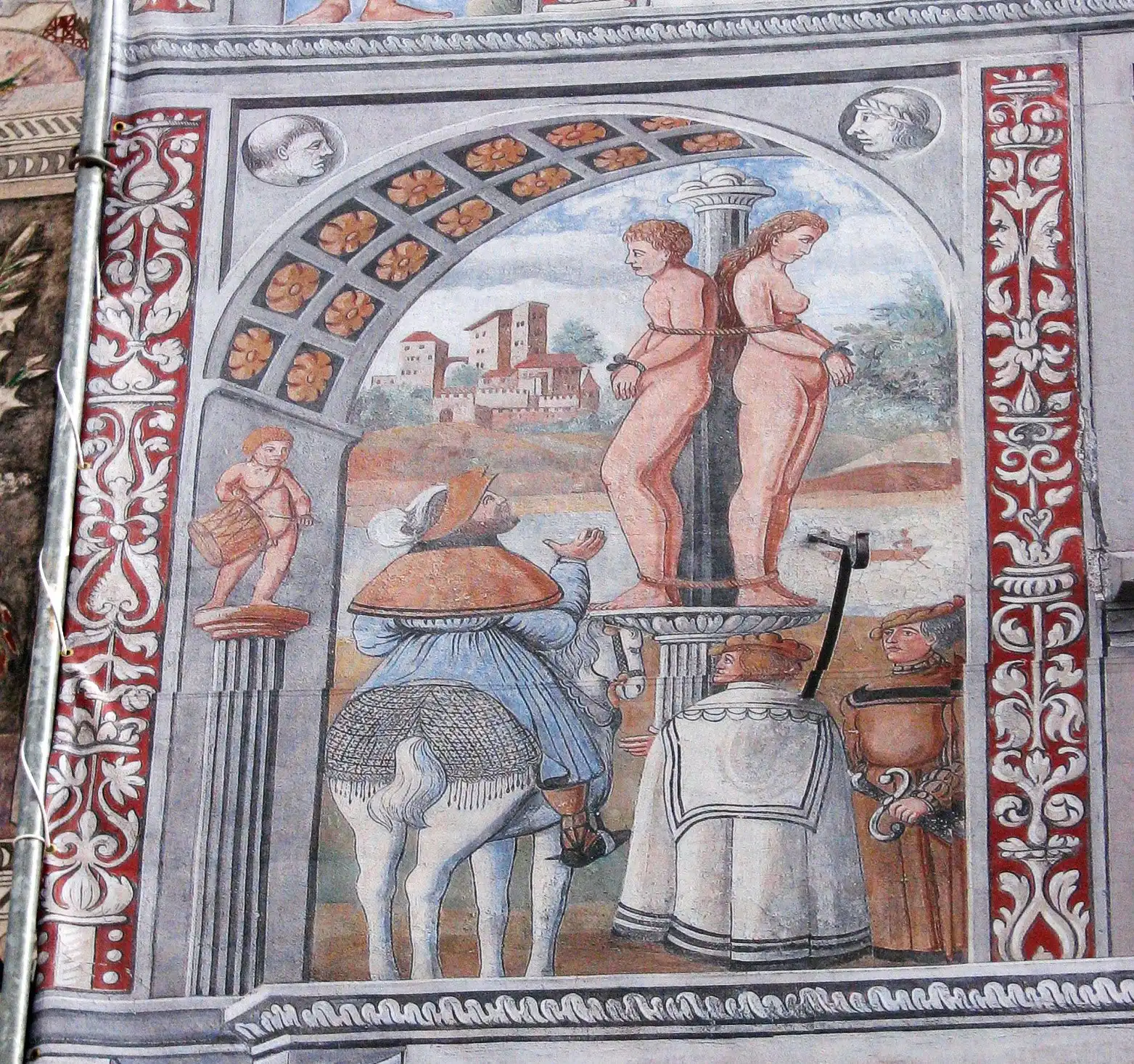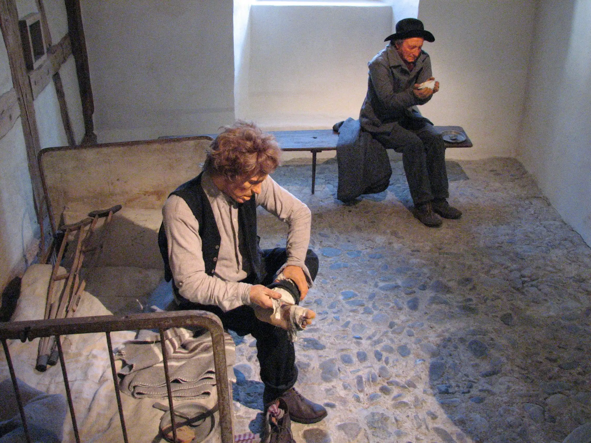 В одном из домов города была устроена богадельня с росписями на фасаде морализаторского характера… грешники у позорного столба; женщина, отдающая незаконного младенца в приют для сирот; девочка, сопровождающая бабушку; мальчик, беседующий со стариком-инвалидом…