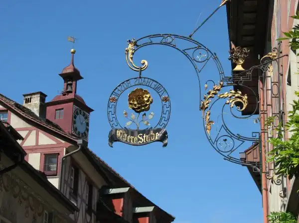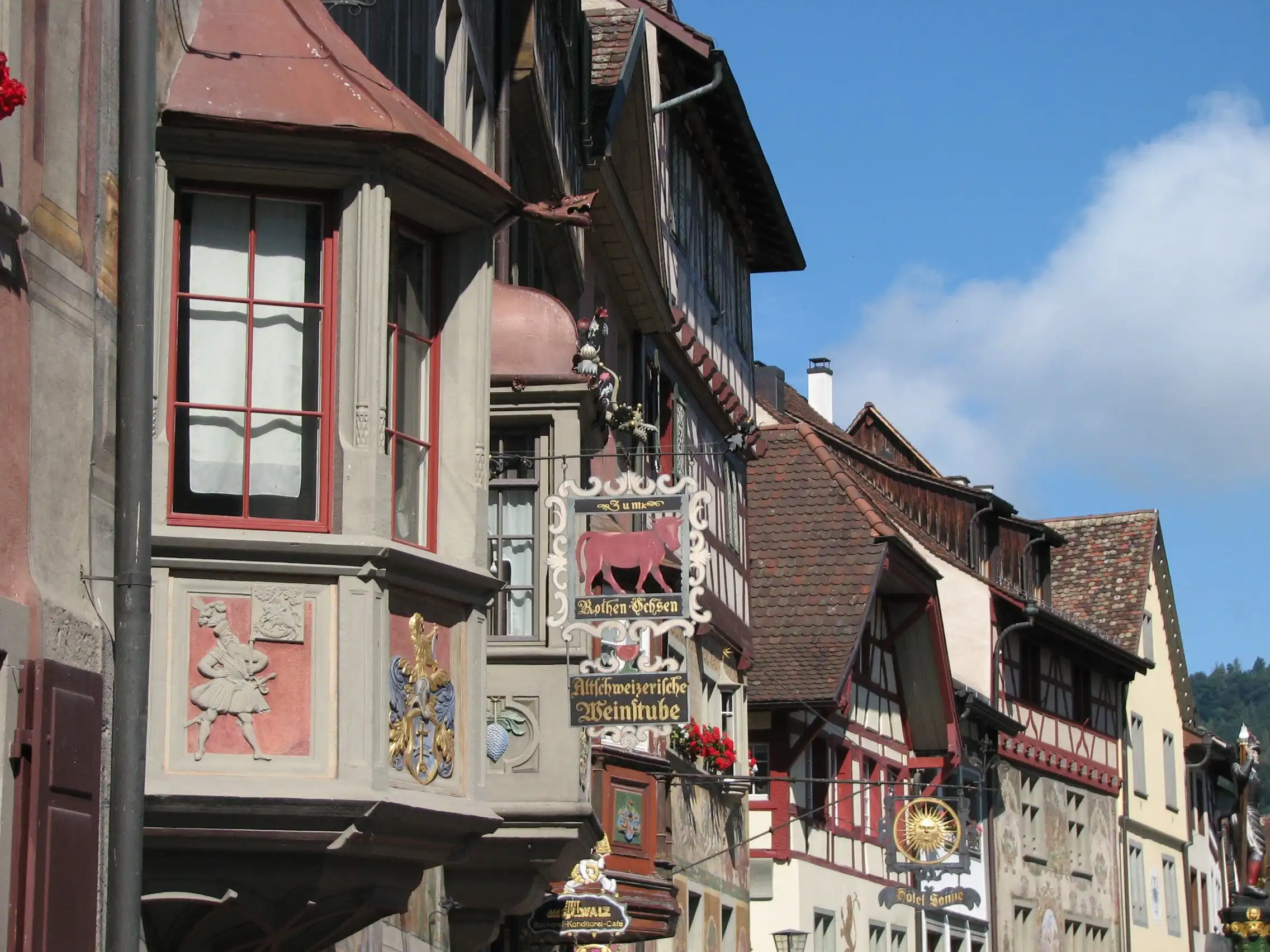Штайн-ам-Райн с многочисленными фахтверковыми домами XVI века с фасадами, расписанными фресками, представляет собой одну из самых известных достопримечательностей Швейцарии. Он был основан ещё во времена римлян. Затем маленький городок стал богатеть, а с XI века, когда германский император Генрих II заложил здесь монастырь бенедиктинцев, и расширяться. Можно догадаться, где проходила в Средние века крепостная стена, так как две башни с городскими воротами сохранились до наших дней. Над Рейном возвышается монастырь Св. Георгия с церковью XII века. От монастыря город получил и свой герб, на котором, как и на гербе Москвы, изображён Георгий Победоносец, поражающий копьём змея.