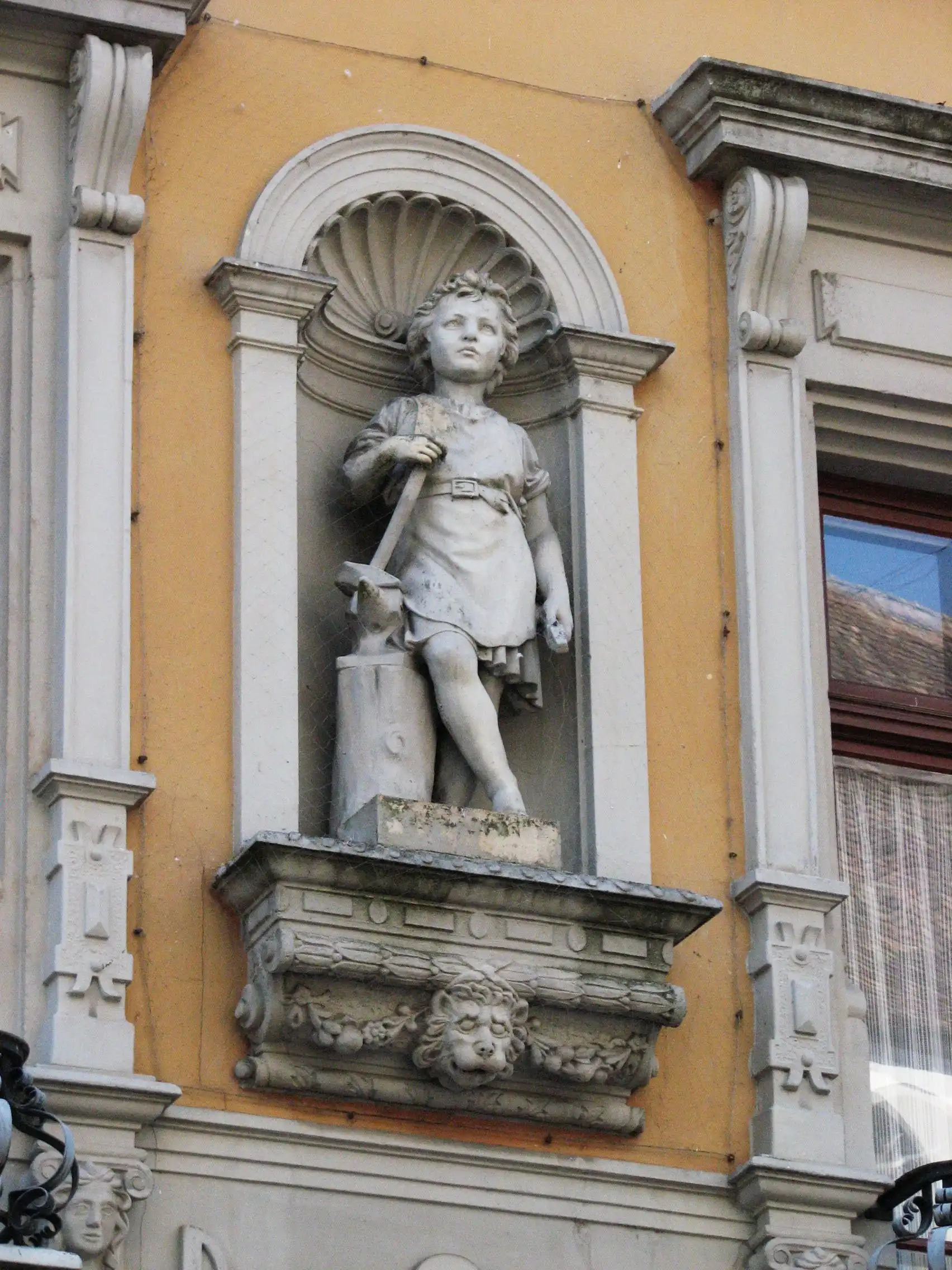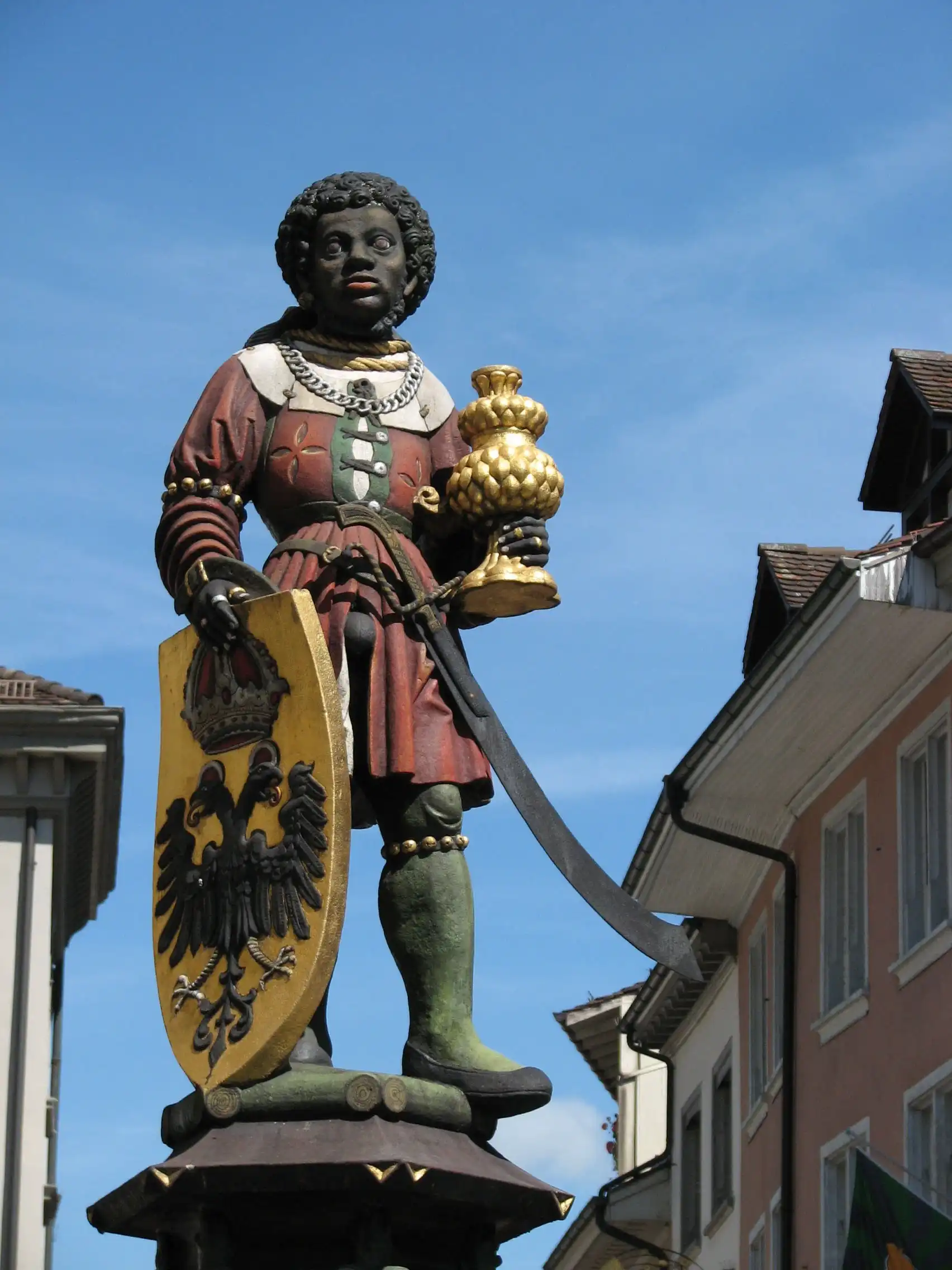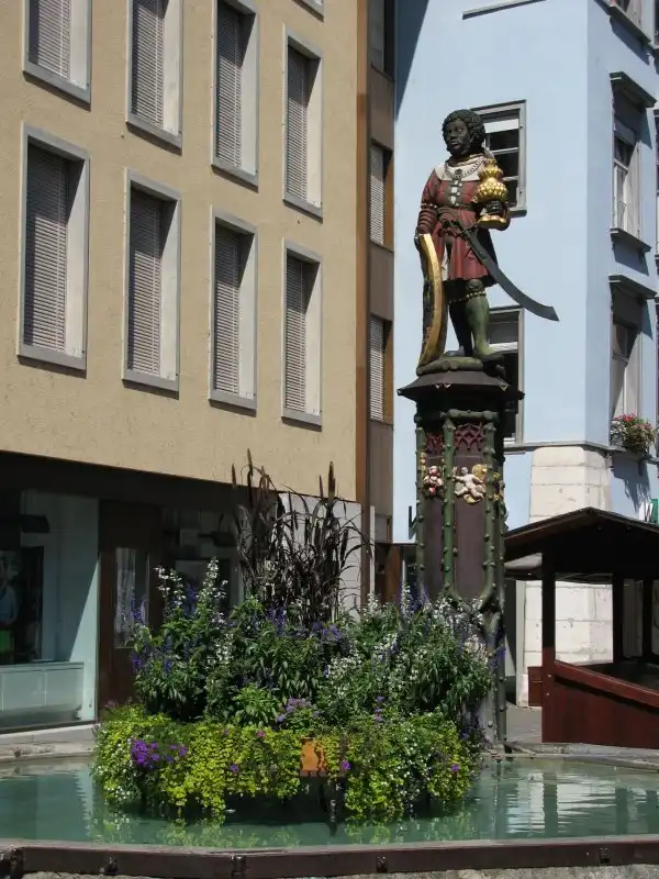 Такие столбы с фигурками устанавливались по какому-либо торжественному случаю во многих швейцарских городах. Здесь представлен средневековый воин-наёмник. Швейцарцы – прирождённые воины-горцы, и услуги швейцарских профессиональных наёмников высоко ценились в Средние века.