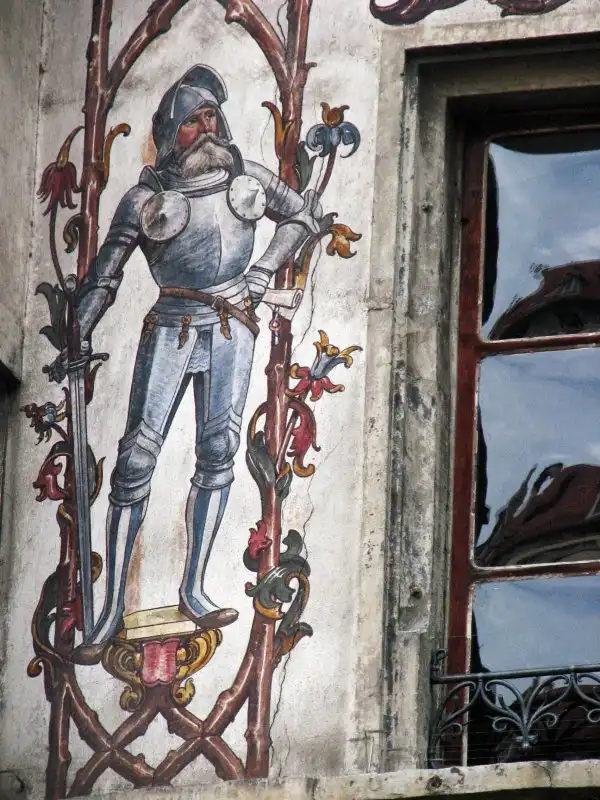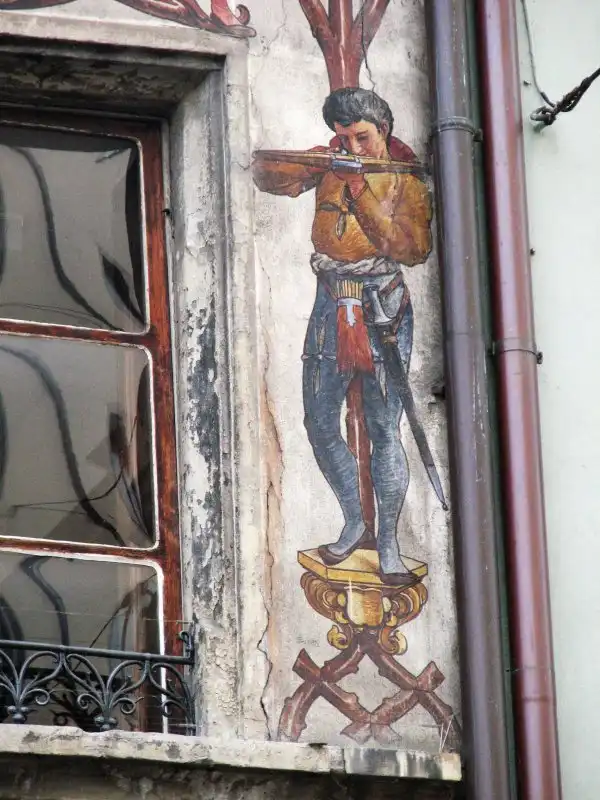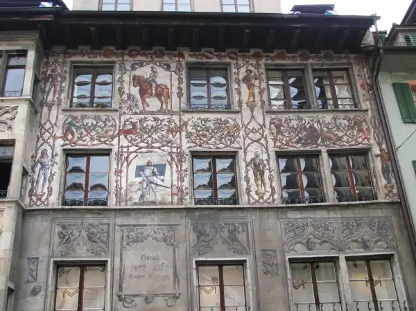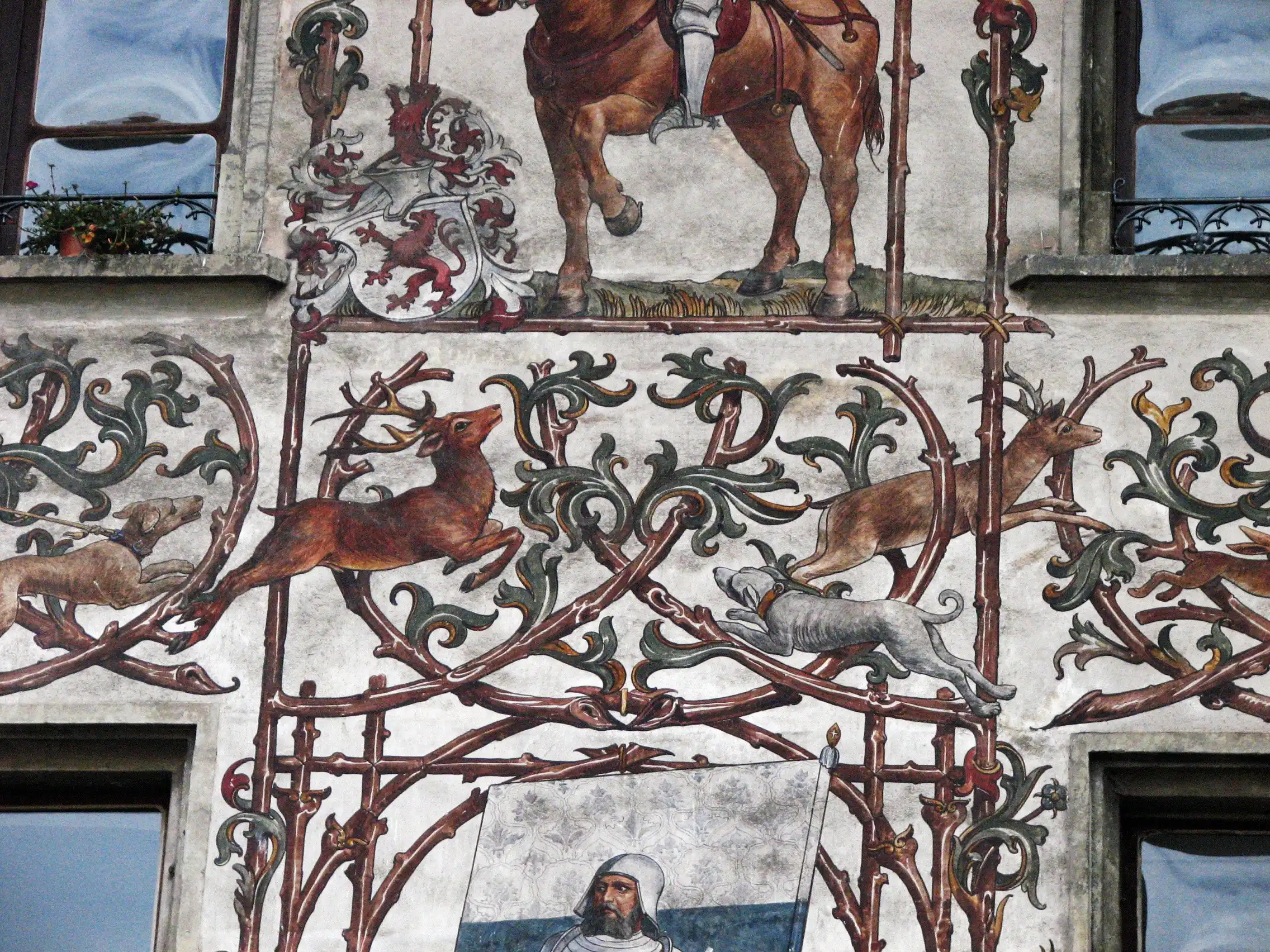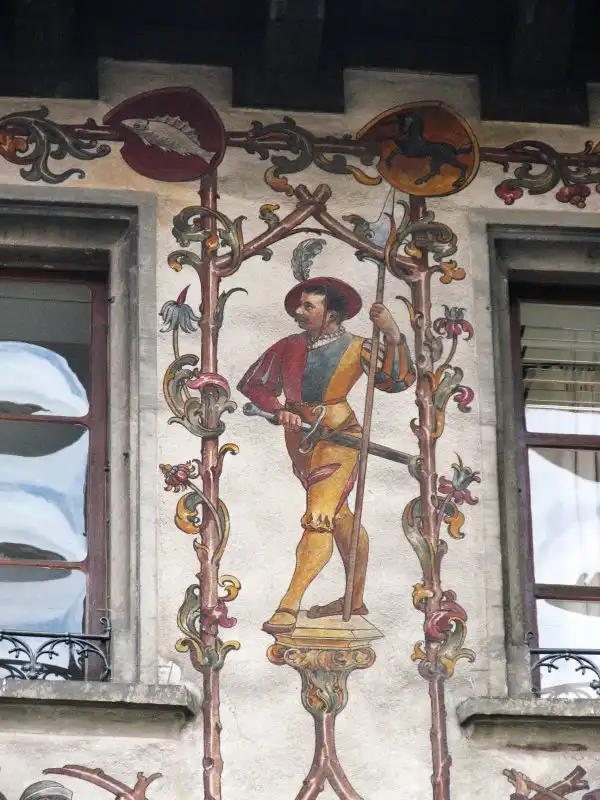 Этот дом привлёк моё внимание великолепными росписями, изображающими типичные костюмы швейцарских воинов в Средневековье и сцены охоты с арбалетом.
