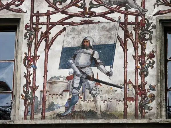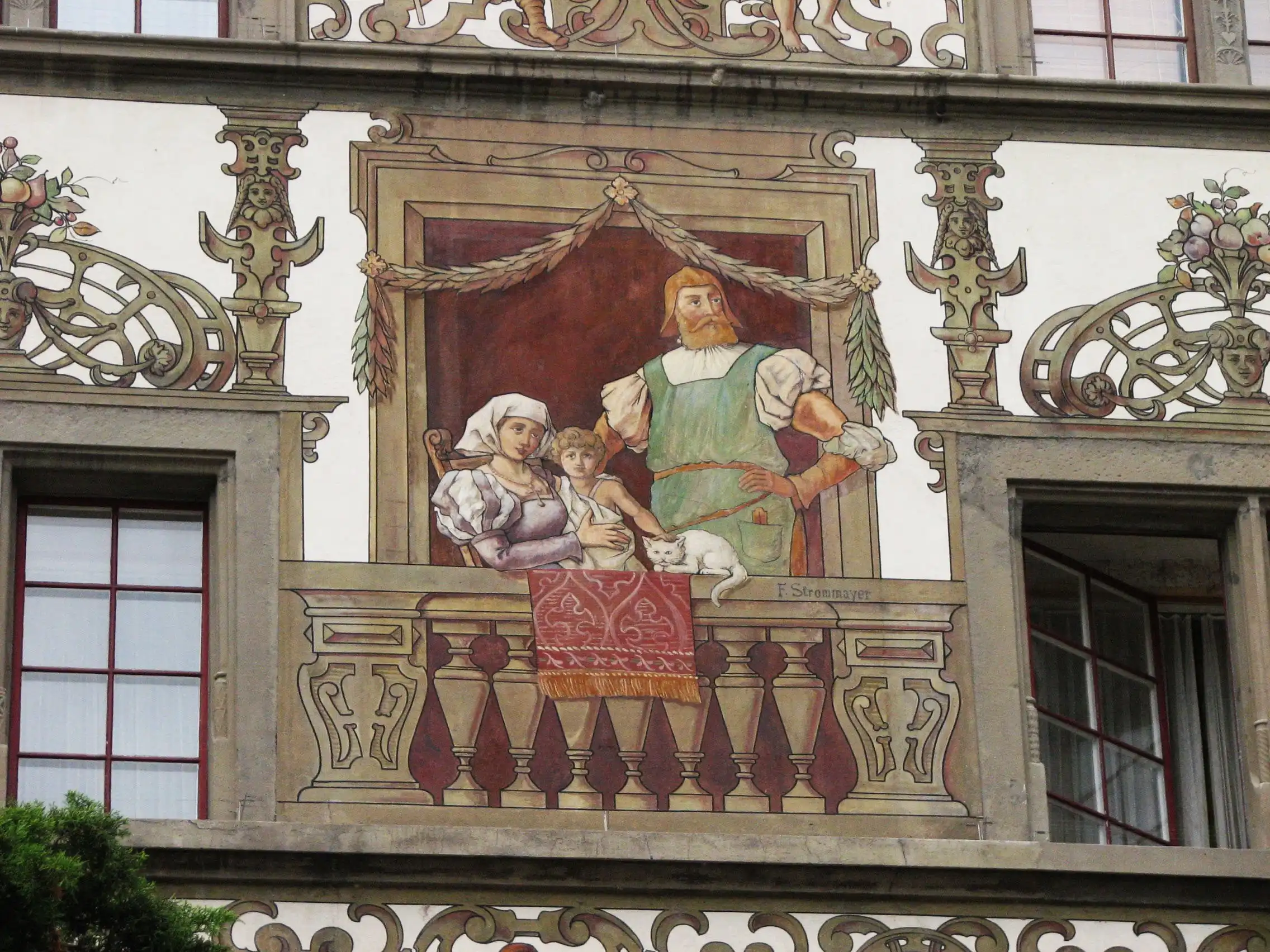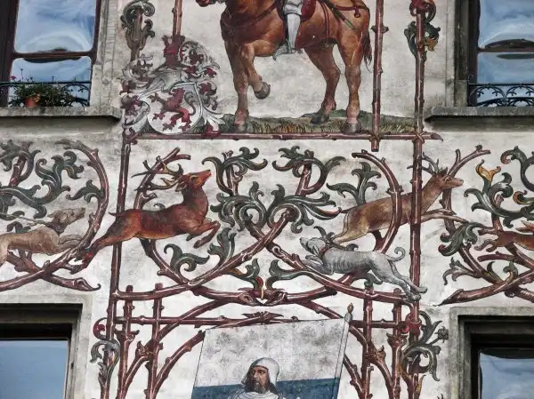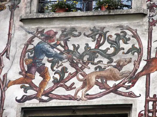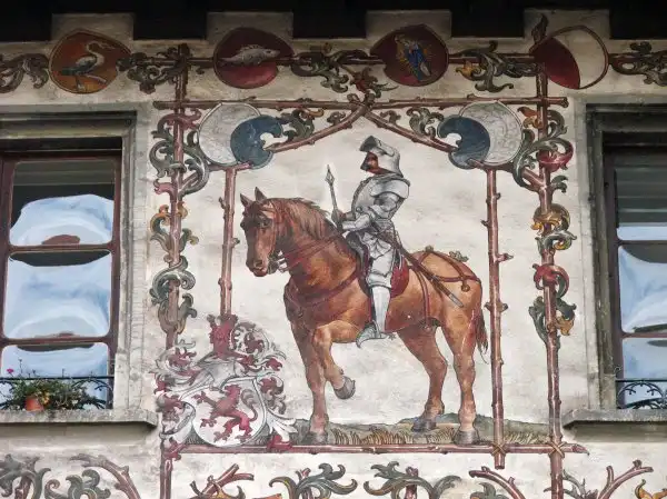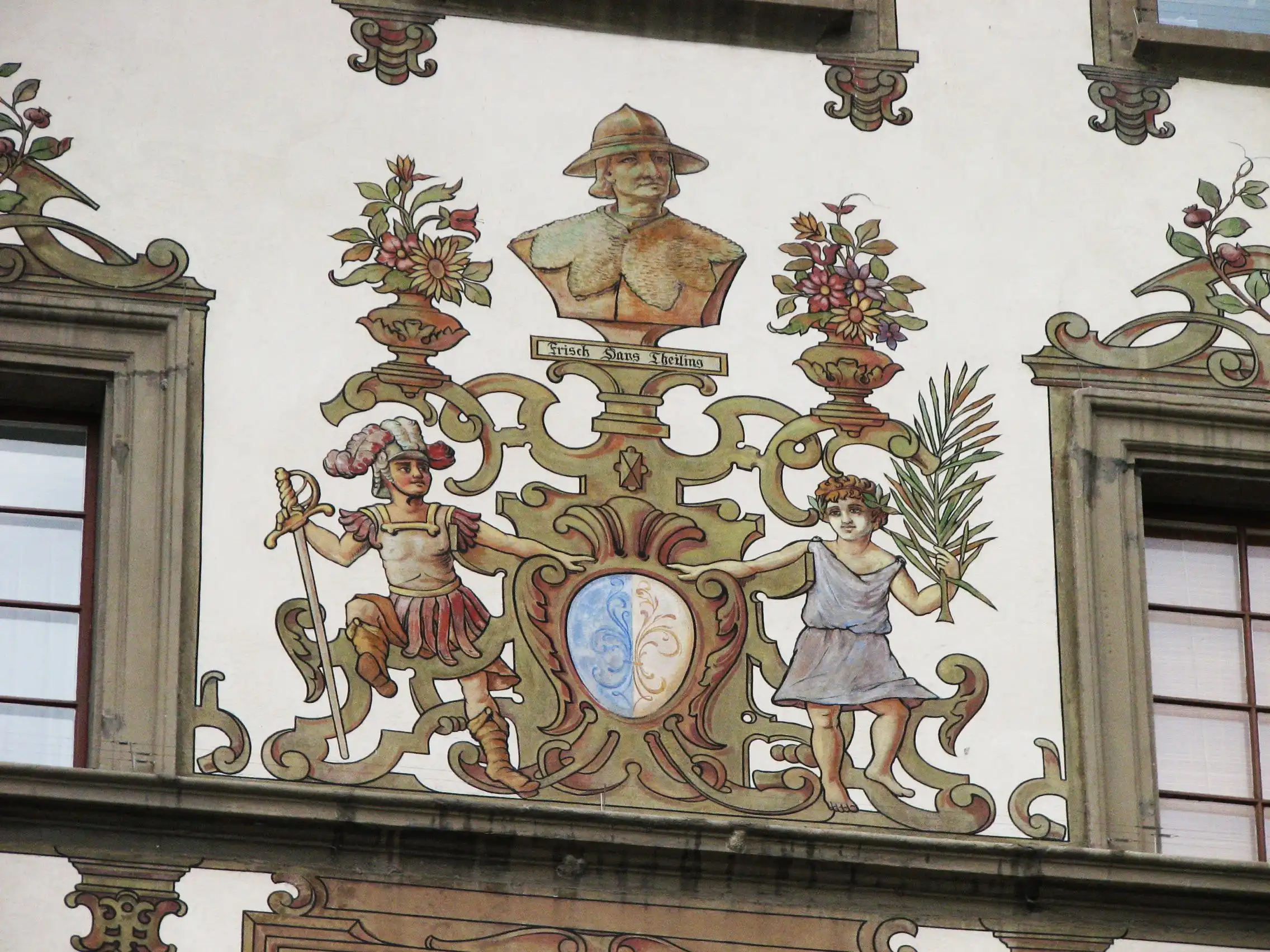 Этот дом привлёк моё внимание великолепными росписями, изображающими типичные костюмы швейцарских воинов в Средневековье и сцены охоты с арбалетом.