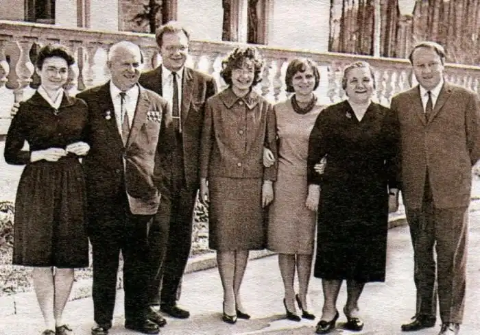 Слева направо: дочь Елена, Никита Сергеевич, сын Сергей, жена Сергея, дочь Рада, Нина Кухарчук, зять Алексей Аджубей.