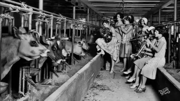 Женская группа в университете штата Висконсин играет серенады коровам в рамках эксперимента изучающего влияния музыки на коров, 1930