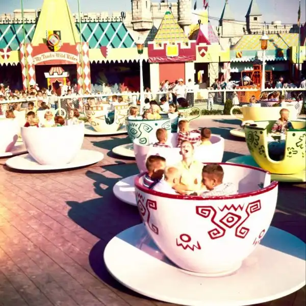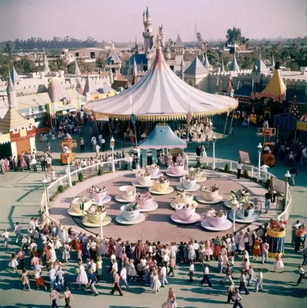 Люди катаются на аттракционе «Безумное чаепитие» в парке развлечений «Диснейленд».