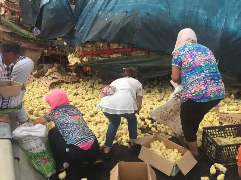 На одной из дорог восточной провинции Китая – Шаньдун – произошло довольно нетипичное ДТП. Грузовик, перевозивший более 10 тысяч цыплят, опрокинулся, после чего птенцы оказались прямо на проезжей части.