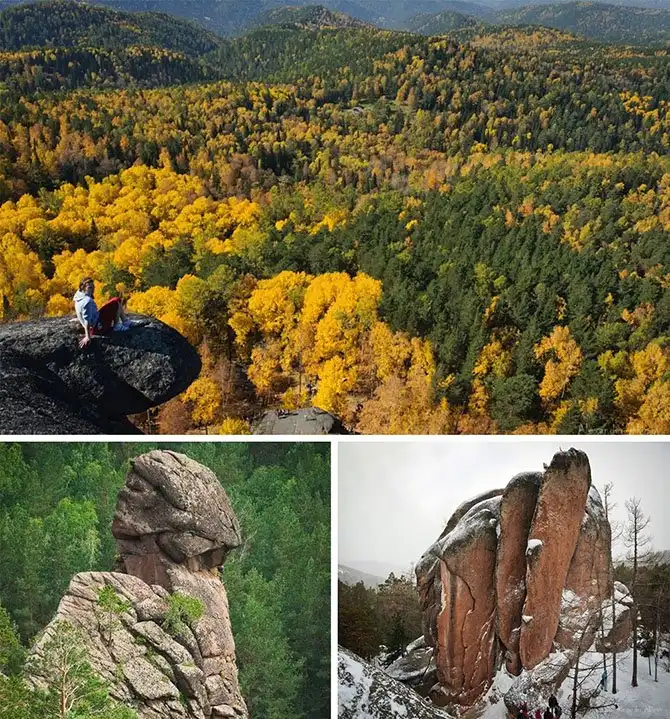 Красноярские Столбы находятся в отрогах Восточных Саян. Посреди дремучей тайги (туристам не советуют сходить с троп, есть риск встретиться с самим Михайло Потапычем) возвышаются древние скалы самых необычных форм, многие из которых напоминают живых существ: Дед, Волчий лоб, Жаба, Слоник. Вокруг Столбов даже сложилось субкультура «столбистов», которые лазят на скалы без страховки. На однодневном маршруте «Природа — великий скульптор» можно любоваться самыми легендарными скалами Столбов и красивейшими видами тайги.