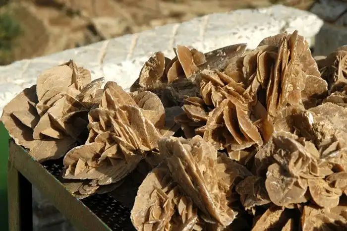 В Тунисе, Алжире, Египте и некоторых других странах, где много песчаных пустынь очень популярным сувениром среди туристов является необычный минерал под названием «роза пустыни». По своей форме эти образования напоминают цветы, чаще всего розы, хотя их форма может быть совершенно непохожей на цветы. Подобные минералы представляют собой сростки кристаллов гипса, образующихся в слое песка. «Роза пустыни» возникает только при определенных условиях, когда в пустыни выпадают осадки. Вода быстро уходит в сухой песок, унося в его глубь частички гипса. Во время испарения вода вновь поднимается к поверхности, образуя уже новые гипсовые кристаллы скрученной формы. Песок также становится частью кристалла, а его размеры могут быть самыми разнообразными. «Роза пустыни» продается как в виде обычного кристалла, так и в виде простеньких брелоков, сувениров, кулонов и других украшений.
