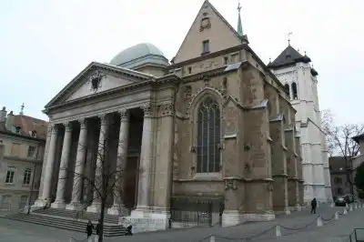 Самый большой и просторный собор Женевы – собор Святого Петра – сочетающий в себе элементы разных стилей, строился на протяжении 70 лет, с 1160 по 1230 гг. Он задумывался в готическом стиле, но включает и ряд раннероманских элементов, а также не сочетающийся с ним главный вход-портал в неоклассическом стиле, который был пристроен в XVIII веке. В 1536 г. он стал протестантским и утратил большую часть богатых украшений, типичных для католических церквей. Эта “чистка” не коснулась только скамей-сидений и витражей на алтаре. Таким образом, получилось, что внутренние помещения собора совершенно лишены украшений и ужасно строги.