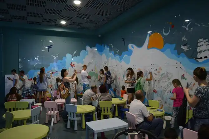 Зона для детей, можно раскрасить стену… Детей не видно, одни взрослые с фотиками…