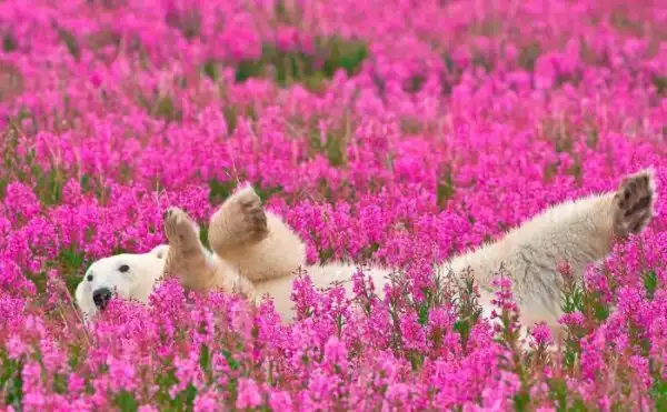Канадский фотограф Деннис Фаст сделал редкий кадр: белый медведь играет в поле иван-чая. Снимок был сделан на севере Канады на побережье Гудзонова залива.