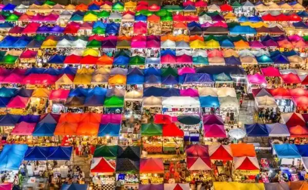 На фото вид с высоты птичьего полета на ночной рынок в Бангкоке. Называется он Талад-Рот-Фай и считается одним из лучших винтажных рынков города.