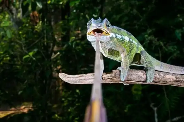 На фото хамелеон и его очень длинный язык. Кстати, традиционно считалось, что хамелеоны изменяют окраску тела для мимикрии под окружающую их растительность. Исследуя пестрого горного хамелеона, обитающего в Северной Африке, ученые пришли к выводу, что хамелеоны используют изменение цвета в первую очередь для коммуникации с представителями своего вида, а не для защиты от хищников.