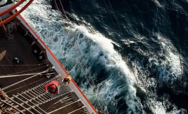 Штормовое предупреждение! Матросы легендарного барка «Седов» поднимаются наверх, чтобы убрать часть парусов из-за угрозы сильного шквального ветра.
