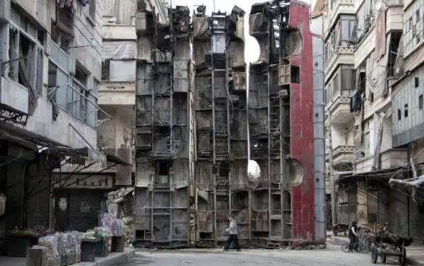 Вертикально размещенные автобусы защищают от снайперов жителей одного из кварталов города Алеппо, Сирия.