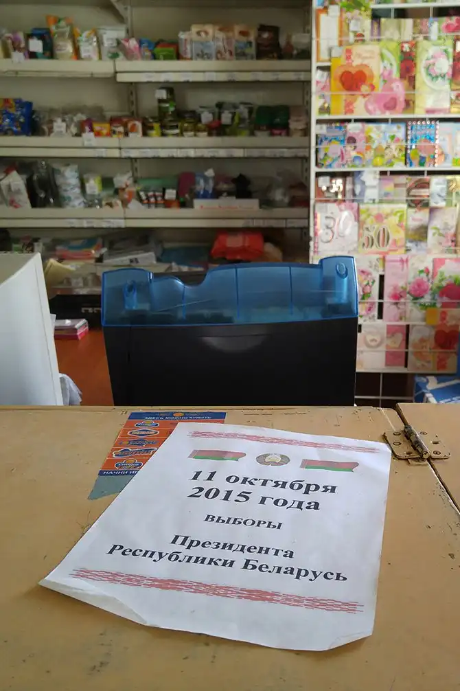Удивительное дело, в этом отделении принимают пластиковые карты всех платежных систем, включая национальную белорусскую. Как известно, дверь является самой важной рекламной площадью в таких местах, поэтому самое важное объявление висит именно здесь. Никто не должен забыть, что 11 октября Лукашенко выбирают на очередной президентский срок.