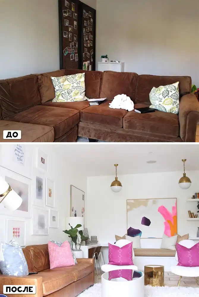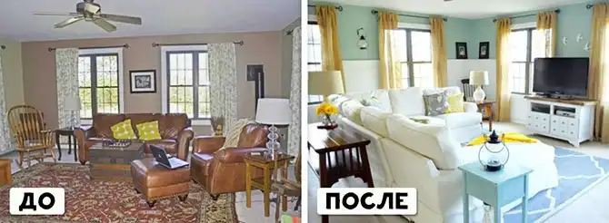 Никаких кардинальных перемен в этой комнате не произошло, но теперь она смотрится куда эффектнее. Все, что нужно, так это заменить нынешнее окно на панорамное, стены покрасить в более теплый бежевый цвет, поменять мебедь и подобрать под нее торшеры. Пол можно также оставить прежним, просто покрыв его слоем лака.