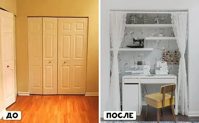 Уголок для настоящего творца. И все это сделано в нише для шкафа. Парочка полок, оригинальные обои, аккуратный стол и штора — все, что нужно для творческой личности. А для идеального сочетания доску на полу можно заменить темным паркетом.