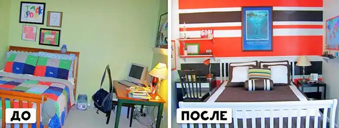 Когда ваш мальчик вырос, дизайн его комнаты нужно незамедлительно менять. Он наверняка больше не играет в игрушки, и наверняка уже насмотрелся на все эти детские рисунки и плакаты со супергероями на стенах, поэтому их сразу отправляйте на чердак. От милого зеленого цвета придется тоже отказаться. Его заменят стильные двухцветные акриловые полосы на одной из стен. Огромный рабочий стол можно заменить на стильный небольшой столик, а кровать просто обновить, перекрасив в белый цвет.
