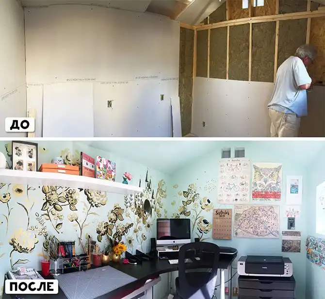 Для того, чтобы работалось наиболее плодотворно необходимо создать вокруг себя обстановку, которая будет этому способствовать. И холодные голые стены — это то, чего однозначно стоит избегать. В варианте «После» цветовая палитра содержит яркие цвета, контрастирующие с полом и другими природными деревянными элементами. На полу, кстати, постелена искусственно состаренная паркетная доска. Если и работать, то только в такой комнате!