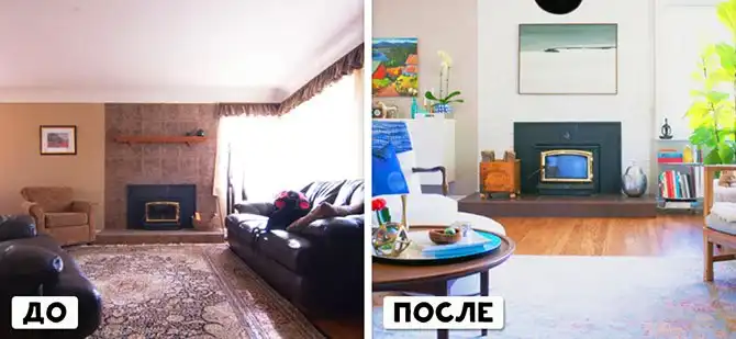В данном случае ламинат на полу заменяем на более светлый, чтобы придать комнате уюта. Стены покрываем также светлой акриловой краской, занавески меняем на жалюзи и портал искусственного камина покрываем декоративной штукатуркой «Марракеш», либо можно просто обойтись отделкой плиткой.