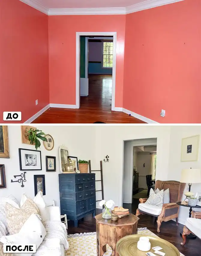 Эта гостиная преобразилась до неузнаваемости. Она была выполнена в традиционном стиле с преобладанием темных цветов. Теперь же это яркая комната, выполненная в стиле «коттедж». Для этого стиля характерна одна цветовая гамма, функциональная мебель и использование преимущественно белого цвета. Стены также обшиваем беленым дубом. Непрактично, скажете вы? Но при должном уходе, такая красота однозначно прослужит вам долго.
