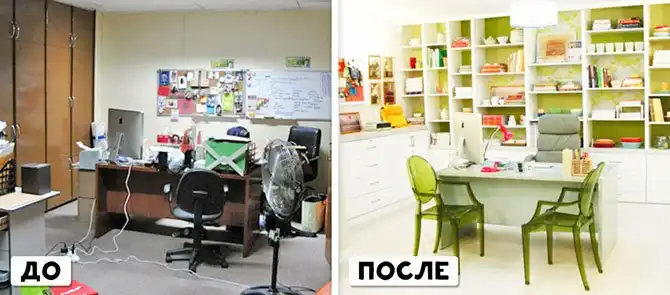 Офис — это место, где мы проводим большую часть нашего времени, и нам должно быть там уютно. Добавим цвета на стены, белоснежных полок с оригинальными аксессуарами, яркие стулья и светлый ламинат на пол, и работать здесь будет гораздо приятнее.