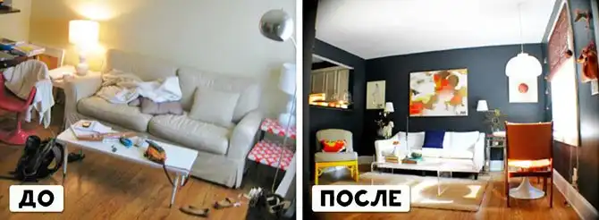 Сделать из темной и мрачной комнаты яркую — это обычное дело. Но вдруг хозяевам уж очень нравятся темные цвета. И такая гостиная — идеальный вариант. Нужно всего лишь покрасить стены в любой темный оттенок. На таком фоне любая светлая и яркая мебель будет выглядеть крайне эффектно. Пол менять необязательно, достаточно просто покрыть его слоем лака, и он будет выглядеть как новый.
