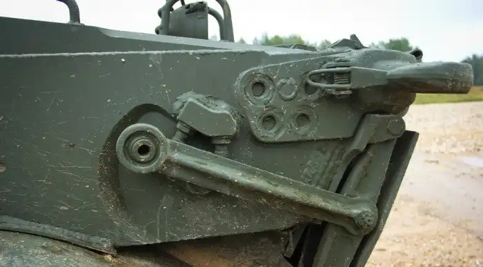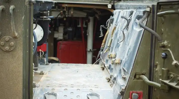 Продолжим осмотр с кормы: два водомета и два люка для десантирования, за которыми – достаточно высокий пол, под которым компактно расположены дизельный двигатель УТД-29 V10 мощностью 500 л.с. и коробка, хотя слово «коробка» звучит здесь пошло: гидромеханическая трансмиссия – так будет правильнее. Распахнув две верхние створки отделения, которые военные называют «бабочками», получаем полноценный бронированный коридор для высадки десанта. 5 десантников сзади и 2 по двум бортам спереди должны засунуть себя в машину по нормативу за 14 секунд. Выполнить это вполне возможно, я пытался несколько раз проделать этот путь – ничего сложного нет, в люки и отсеки мой не очень маленький круп пролез без проблем.