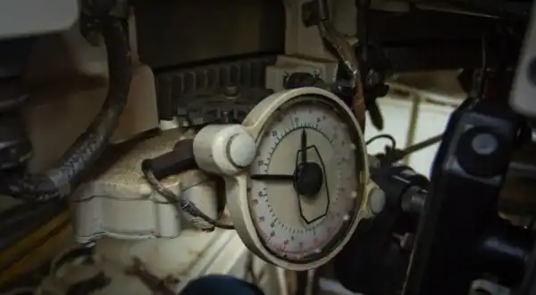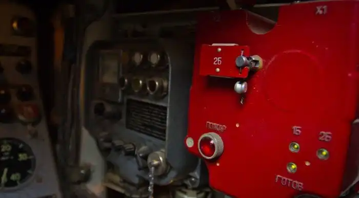 Весь экипаж на местах, поднимаю сиденье и торчу из люка по-походному. Открываю баллон со сжатым воздухом, выставляю ручной газ, нажимаю кнопку стартера и сразу кнопку запуска двигателя. Я ожидал, что дизельный мотор с ревом запустится, но вибраций по конструкции нет. Выжимаю педаль сцепления… так, стоп! Ведь педали сцепления нет, только газ и тормоз. В руках при этом не рычаги или руль, а штурвал, как у самолета! А над штурвалом – «весло» КПП, на манер старых американских автомобилей.