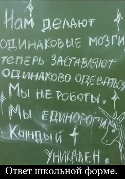 Особенно забавляют фотографии школьниц одетых хрен знает как и с подписями типа "вот и как нормально учиться", а потом "подавляют нашу индивидуальность, делают одинаковые мозги".
